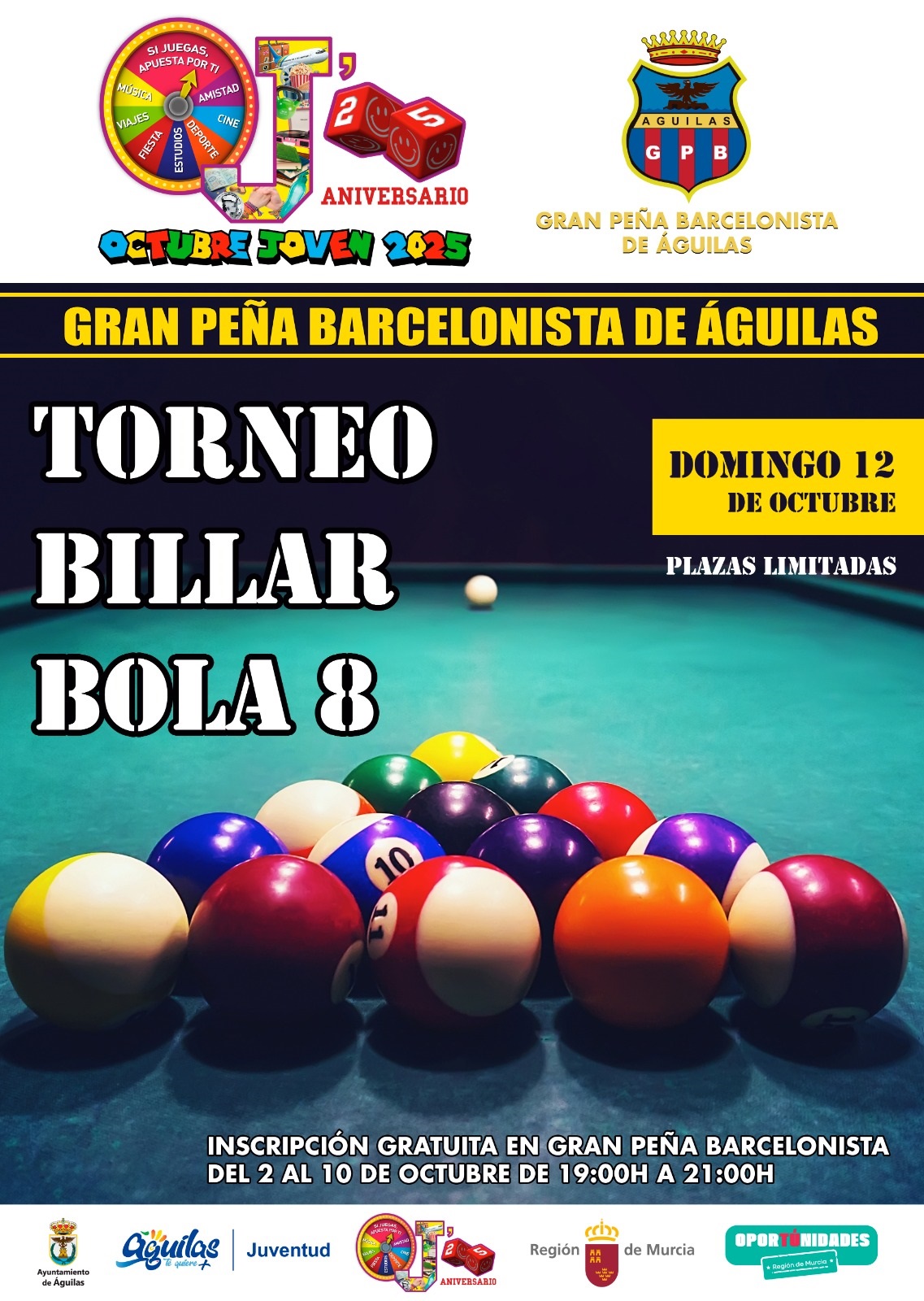 Torneo Billar Bola 8. Inscripción Gratuita. En la Gran Peña Barcelonista de Águilas. Hasta el 10 de octubre de 19:00 h a 21:00 h.