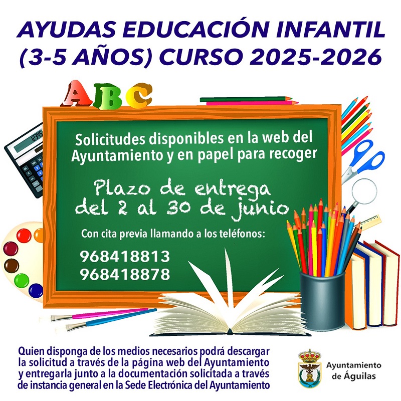 El próximo 02 de Junio se abrirá el plazo de presentación de las solicitudes de ayudas para Educación Infantil (3-5 años). Los interesados en optar a estas ayudas deberán rellenar la solicitud que encontrarán, a partir del 2 de Junio, en la web del Ayuntamiento o, de forma presencial, en el Registro del Ayuntamiento de Águilas.