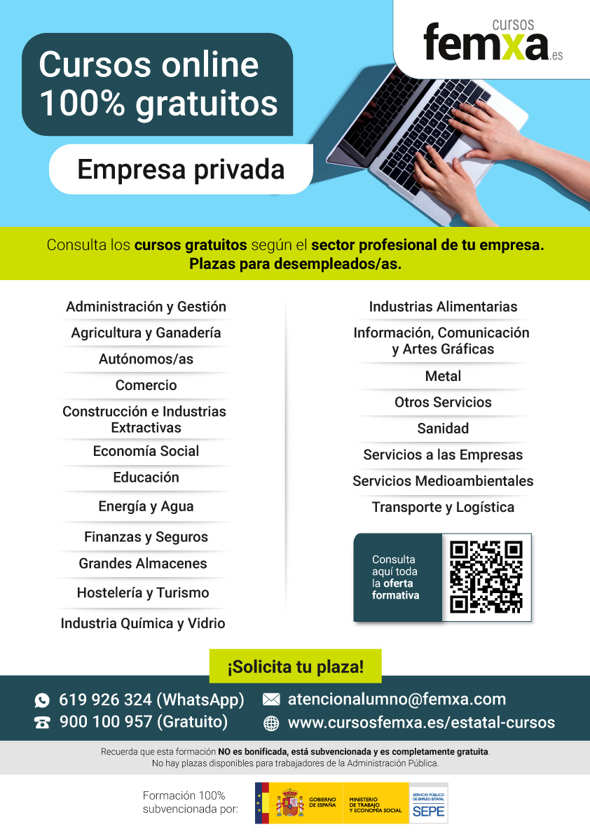 Todos los cursos se imparten en modalidad online y sin horarios, lo que permite a cada persona avanzar a su propio ritmo y compatibilizar el aprendizaje con su vida personal o profesional. Además, algunos cursos reservan plazas específicas para personas desempleadas, lo que facilita la reincorporación al mercado laboral en sectores con alta proyección.