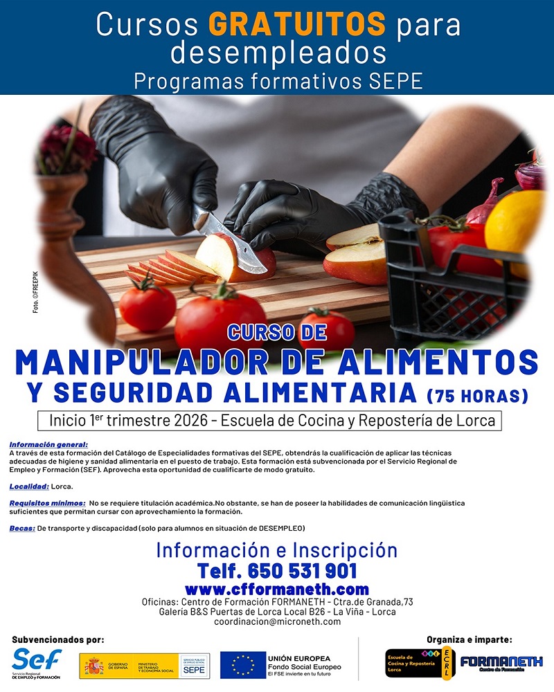 RESUMEN: Curso gratutitos para desempleados. Curso de Manipulador de Alimentos y Seguridad Alimentaria (75 horas).