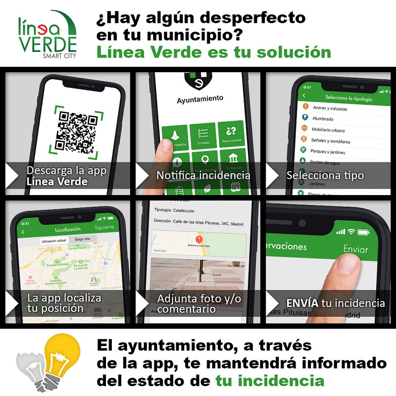 Para poder utilizar este nuevo servicio es necesario proceder a la descarga de la APP Línea Verde. Para ello, el usuario accede a Google Play o APP Store en función de la tecnología empleada en su Smartphone (Android/iOS). Una vez localizada, se lleva a cabo la descarga de forma gratuita. A partir de ese momento, el usuario selecciona el municipio sobre el que quiere comunicar la incidencia. El procedimiento es muy rápido y sencillo.