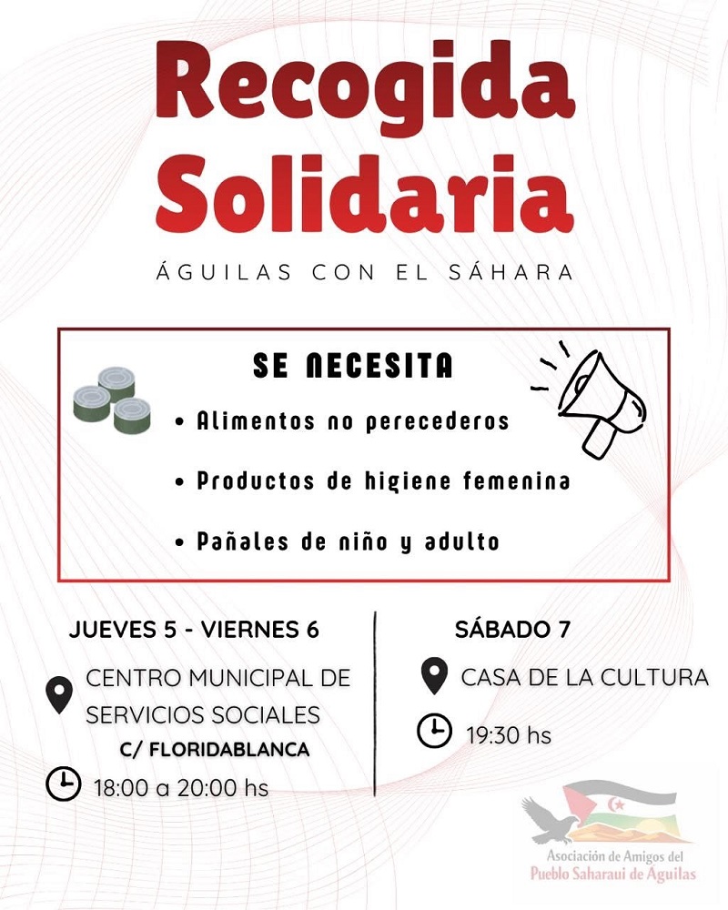 Recogida Solidaria Águilas con el Sahara. Los Días 5, 6 y 7 de Marzo de 2026.