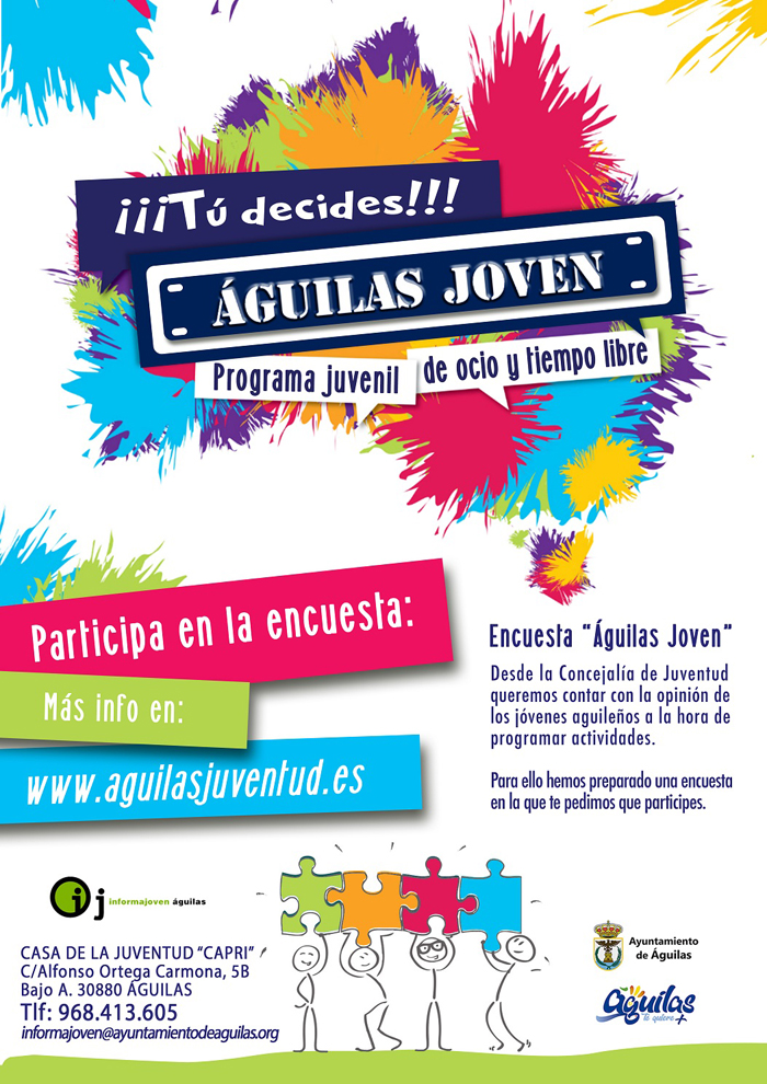 ► Contar con la opinión de los jóvenes es vital a la hora de programar actividades juveniles de ocio y tiempo libre, y para ello quisiéramos contar con vuestra colaboración, la de la juventud aguileña. Queremos confeccionar programaciones trimestrales de “Águilas Joven” con actividades que respondan a vuestros intereses.