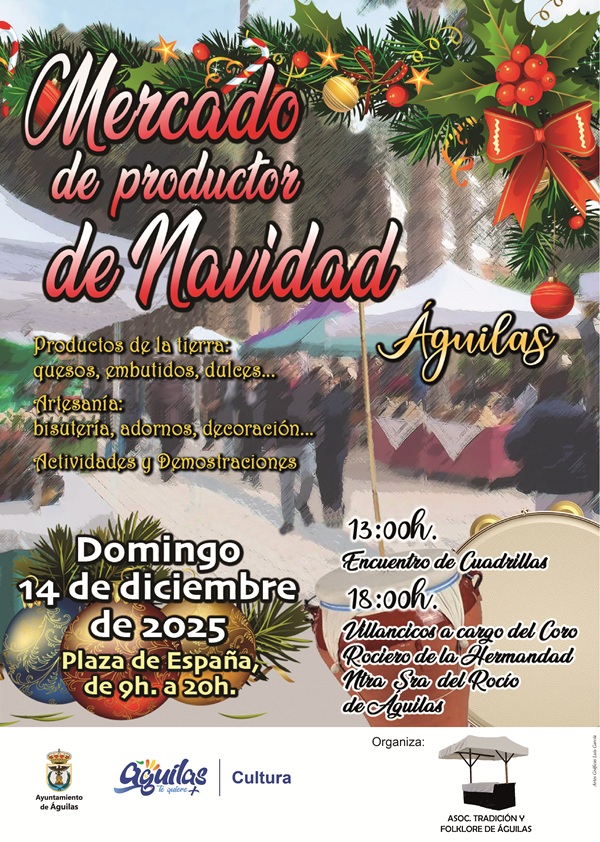 Mercado de Productos de Navidad. A las 13 horas, encuentro de cuadrillas y a las 18 horas, cante de villancicos a cargo del Coro Rociero de fla Hermandad de Nuestra Señora del Rocío.