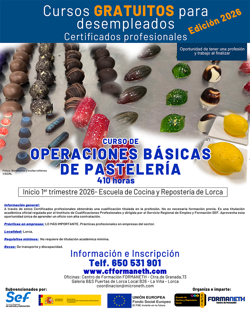 Curso de Operaciones Básicas de Pastelería. de 410 horas. En la Escuela de Cocina y Repostería de Lorca.
