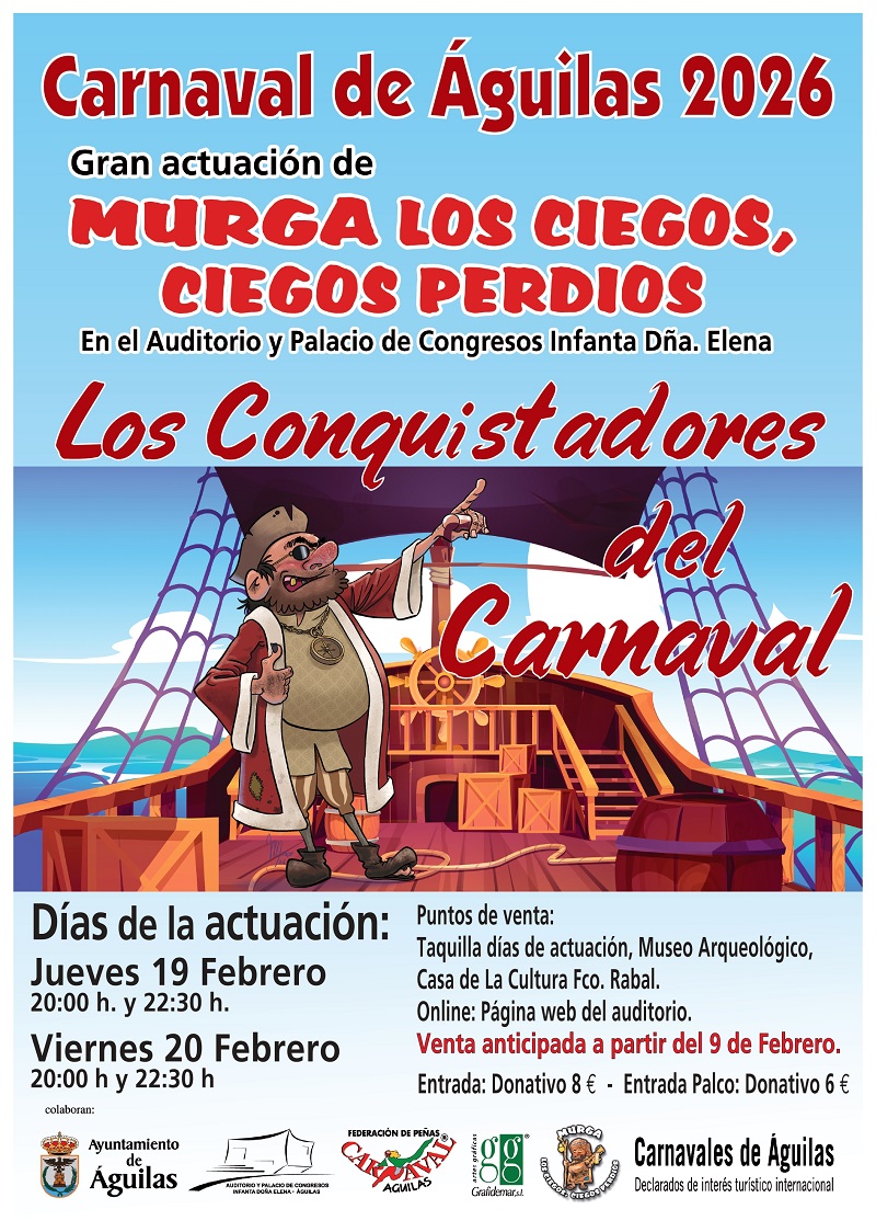 Murga los ciegos, ciegos perdios. Los Conquistadores del Carnaval. En el Auditorio Municipal. Jueves 19/02/2026 y Viernes 20/02/2026 a las 20:00 y 22:30 h.