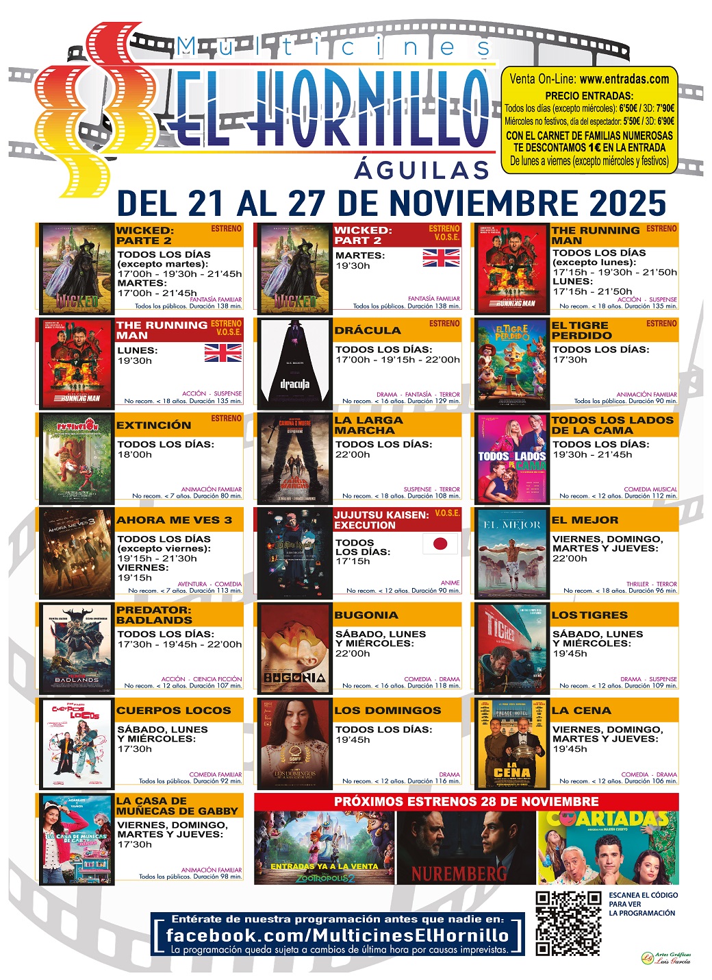Multicines el Hornillo Águilas. Fecha: Del viernes 21 al jueves 27 de noviembre de 2025.