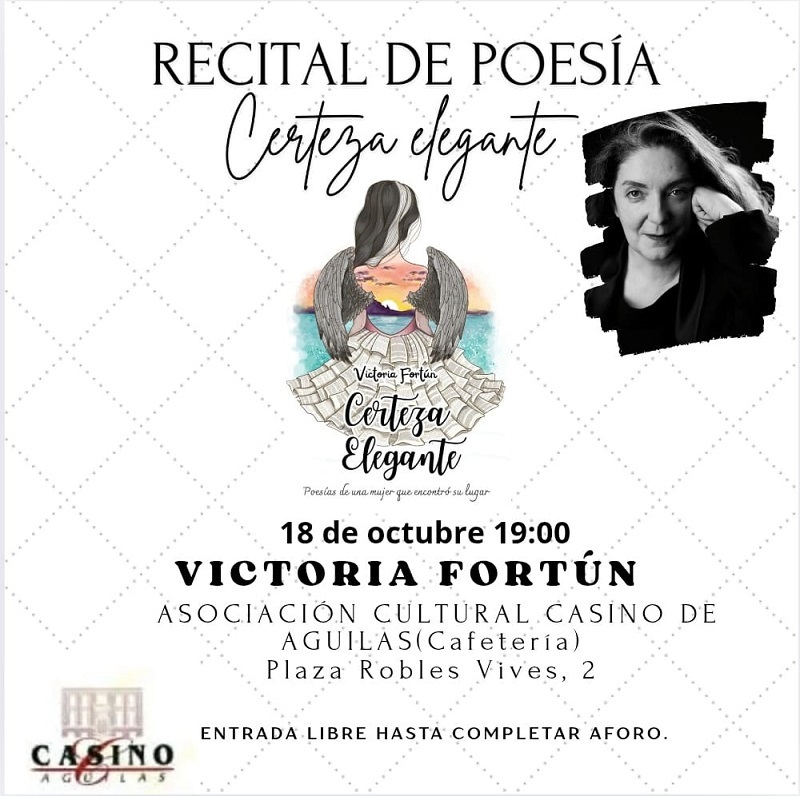Recital de poesía: Victoria Fortún presenta “Certeza elegante”. Poesías de una mujer que encontró su lugar. En el Casino de Águilas.Sábado, 18/10/2025