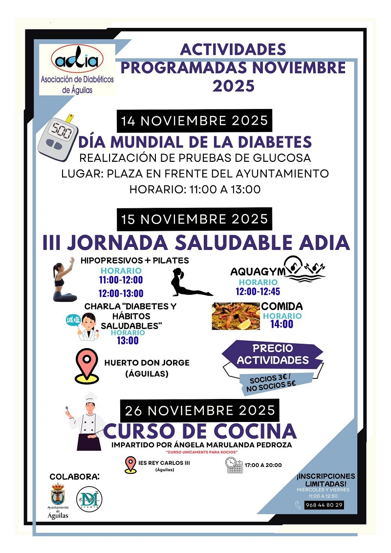 Actividades Programadas Noviembre 2025. Asociación de Diabéticos de Águilas. Los Días14,15 y 26 de Noviembre de 2025.