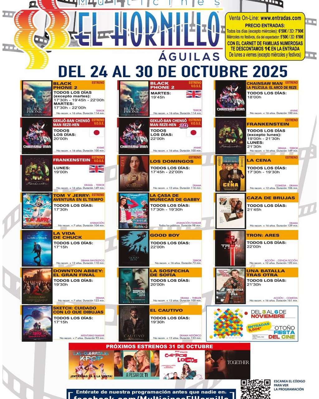 Multicines el Hornillo Águilas. Fecha: Del viernes 24 al jueves 30 de octubre de 2025.