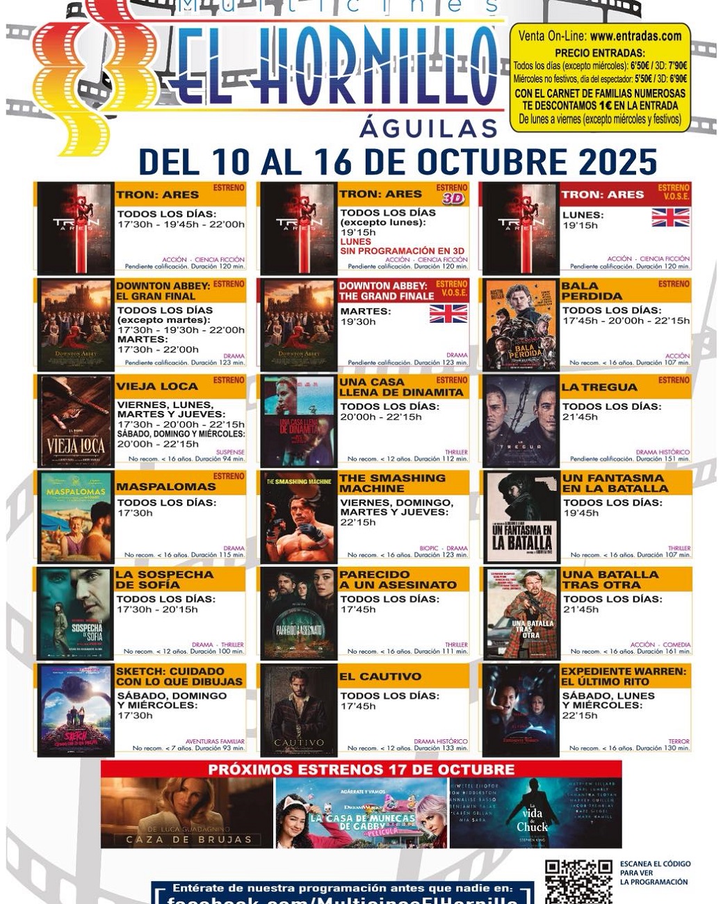 Multicines el Hornillo Águilas. Fecha: Del viernes 10 al jueves 16 de octubre de 2025.