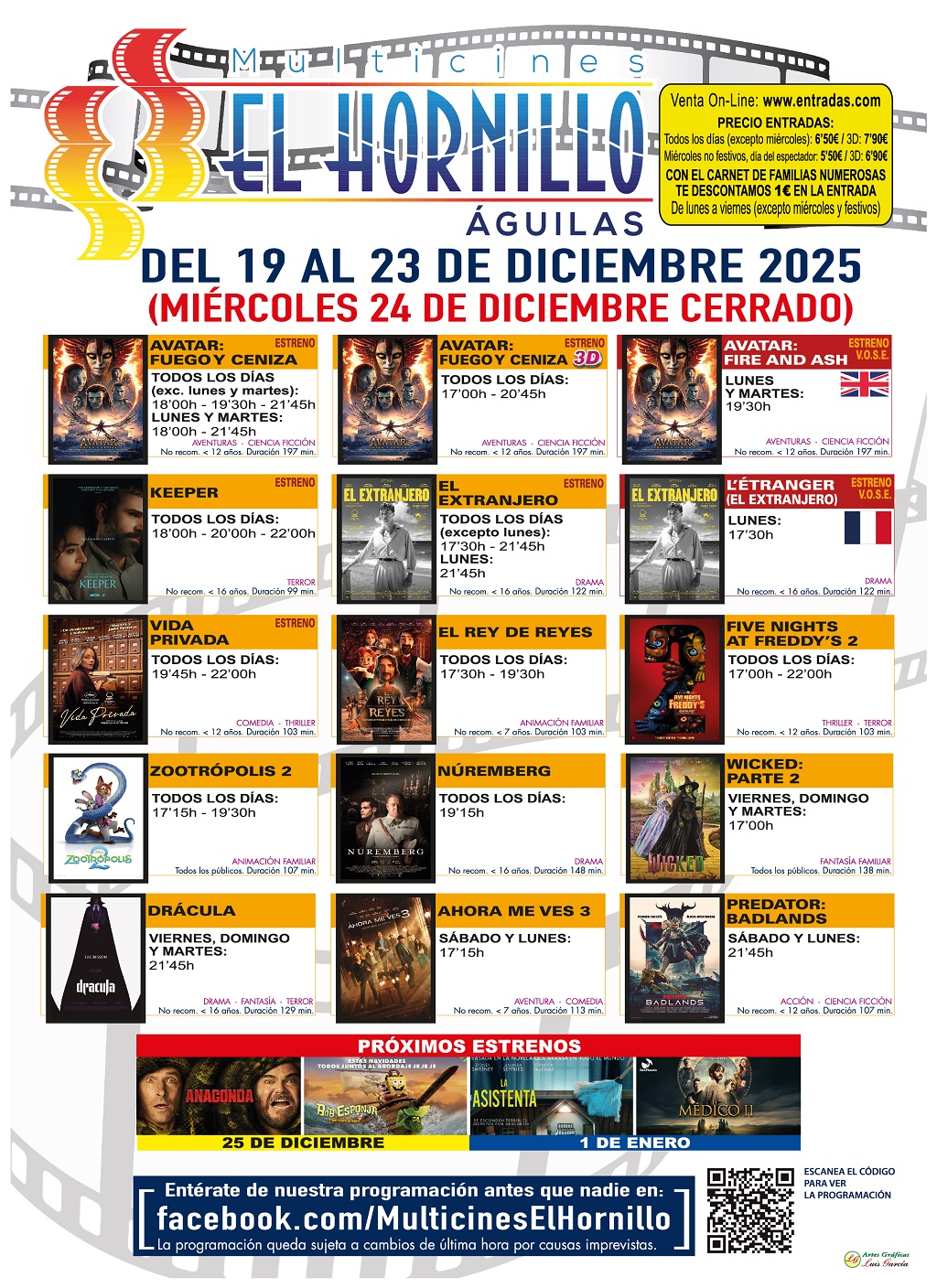 Multicines el Hornillo Águilas. Fecha: Del viernes 19 al jueves 23 de Diciembre de 2025.