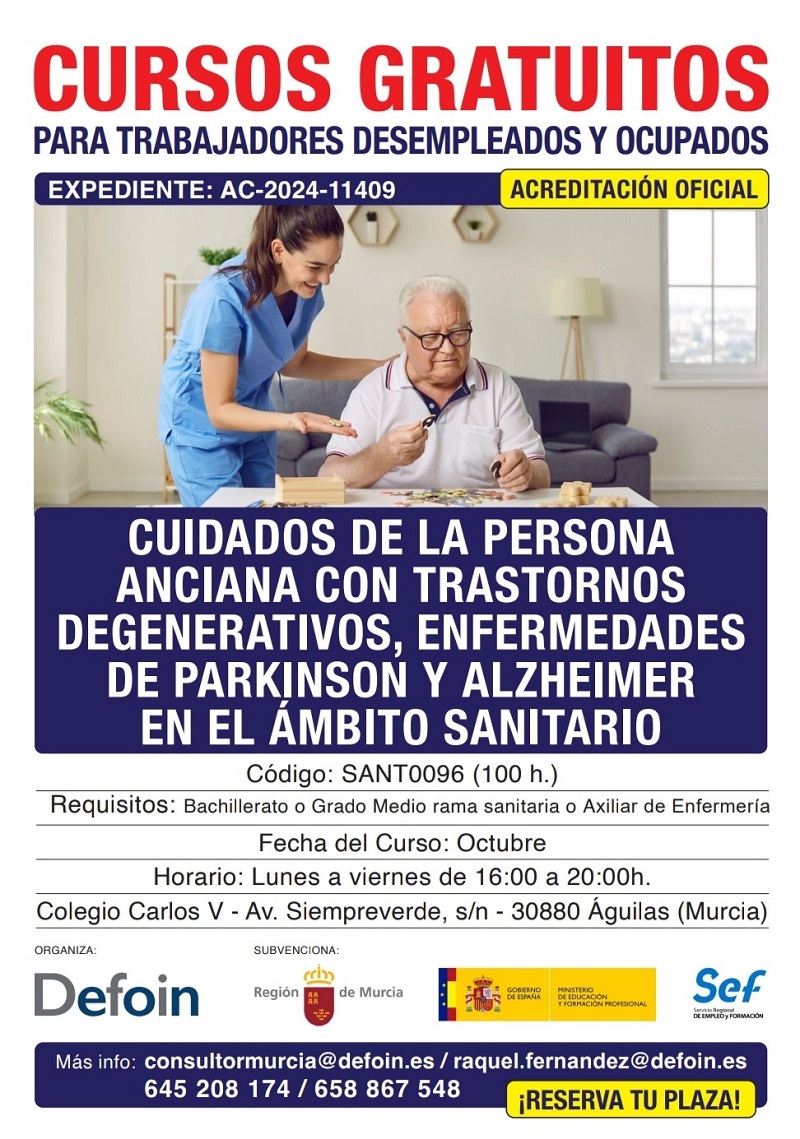 Cuidado de la persona anciana con trastornos degenerativos, enfermedades de parkinson y alzahimer en el įmbito sanitario. Plazo: Abierto.