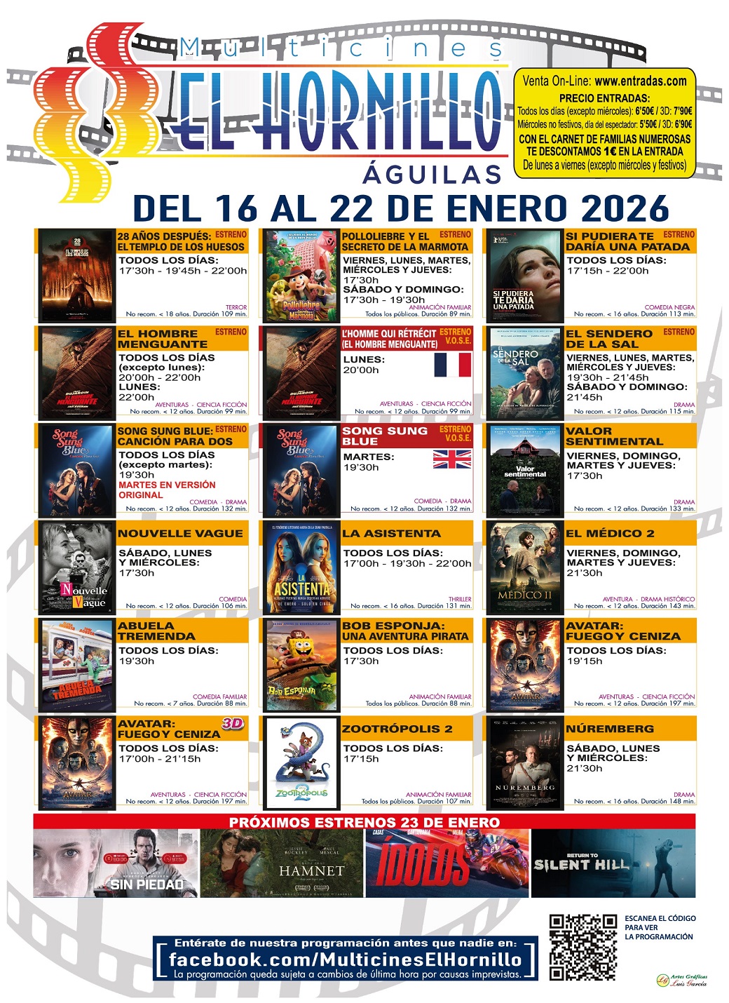 Multicines el Hornillo Águilas. Fecha: Del viernes 16 al jueves 22 de enero de 2026.