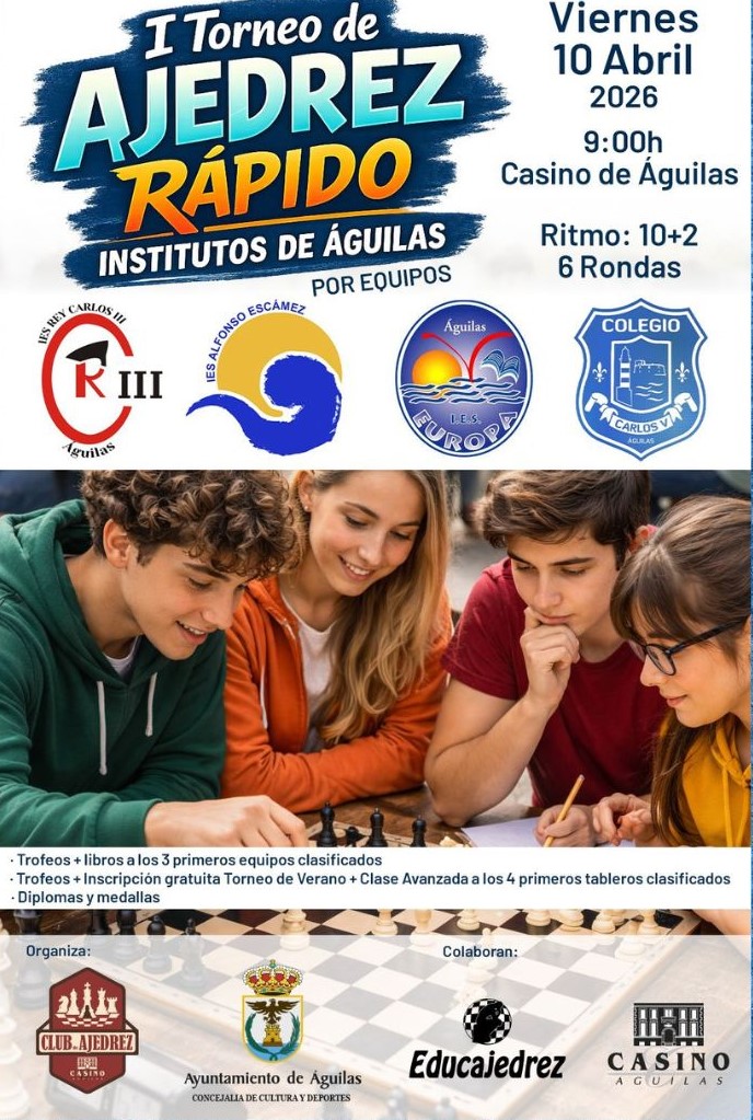 I Torneo de Ajedrez Rápido. Institutos de Águilas por equipos. A partir de las 9 horas en el Casino. Ritmo 10+2, 6 rondas. Premios: Trofeos, medallas, diplomas, libros, plaza de participación en el Torneo de Verano y Beca de Estudios Nivel Avanzado en Ajedrez para los ganadores.